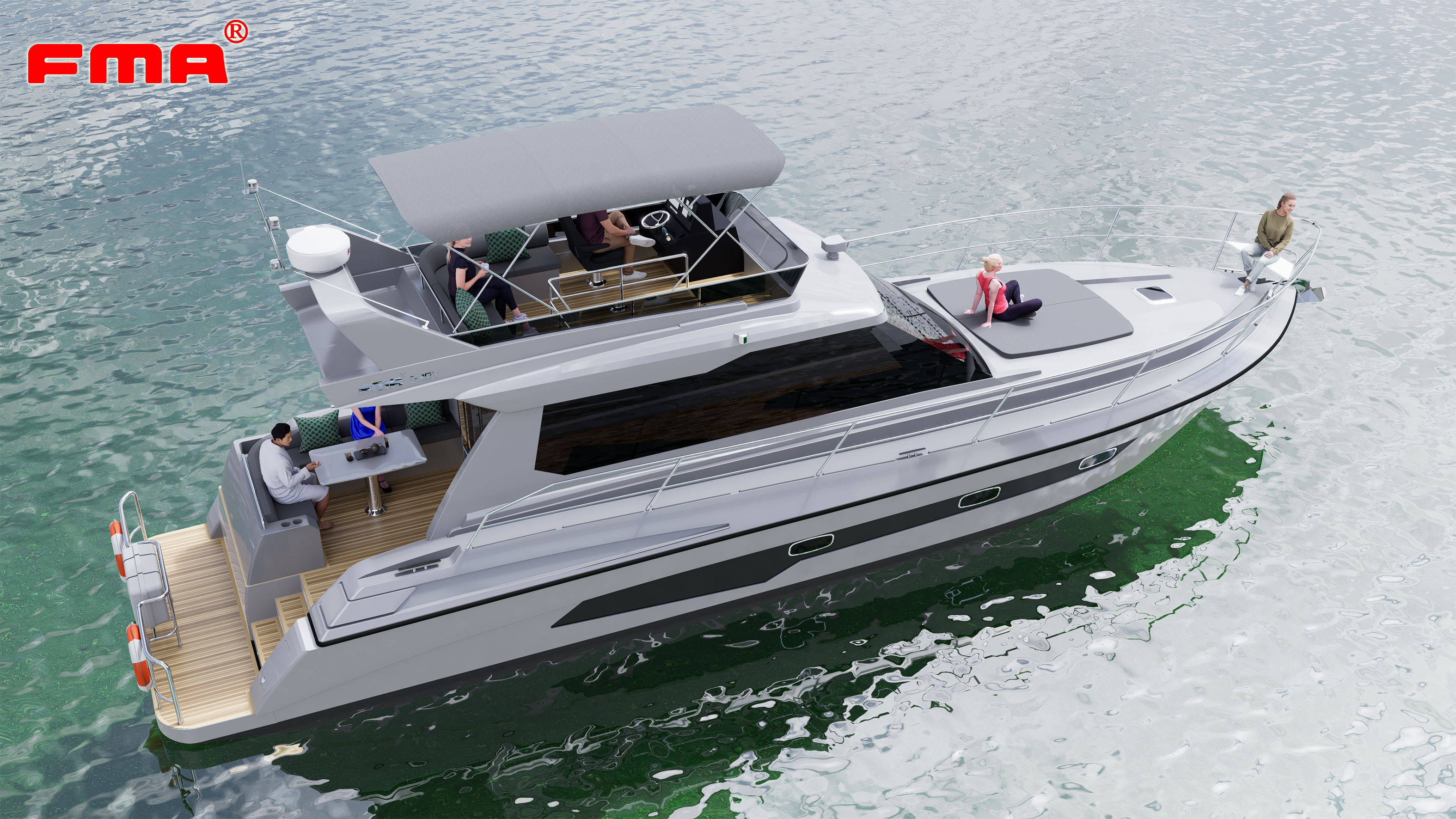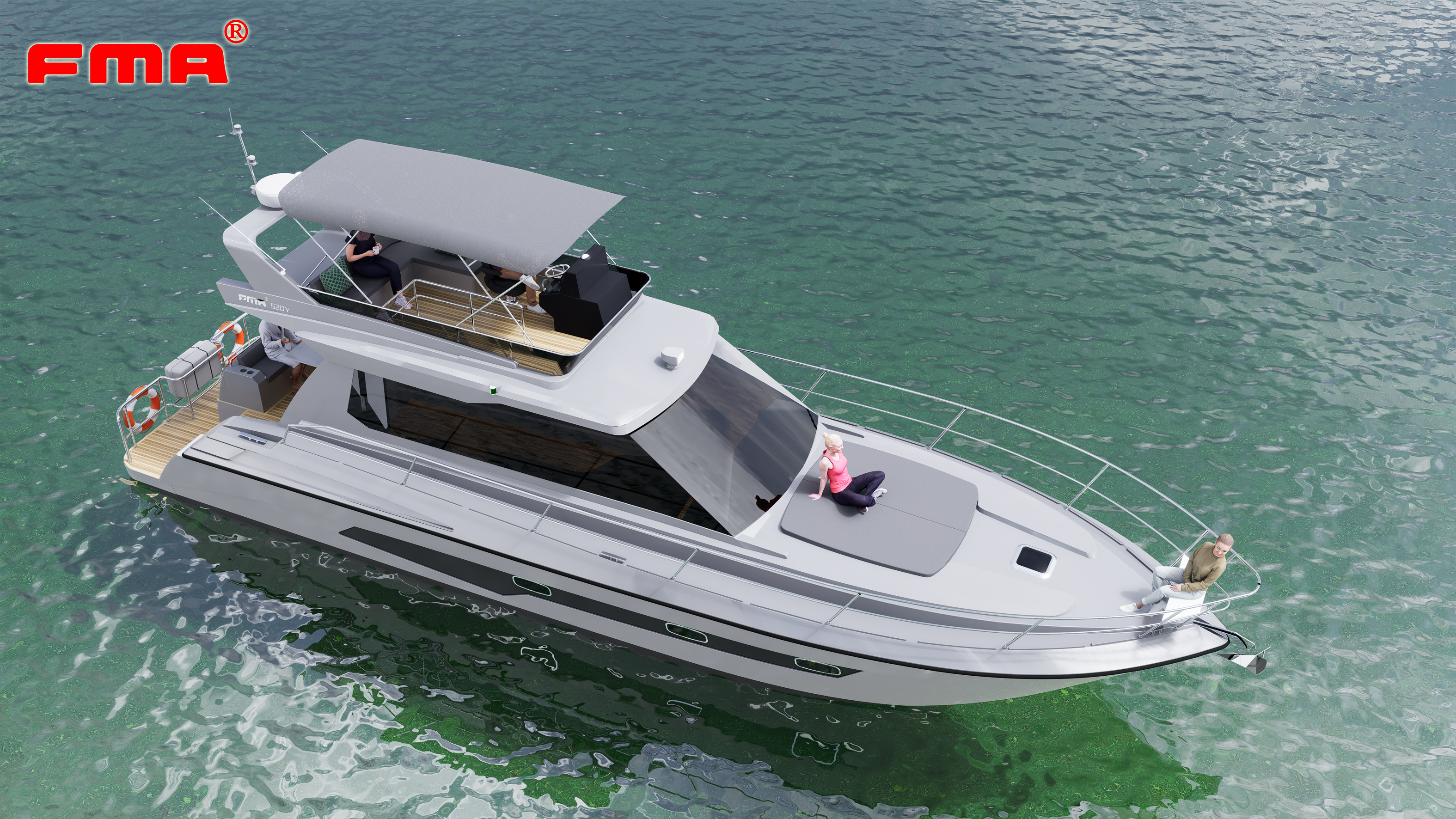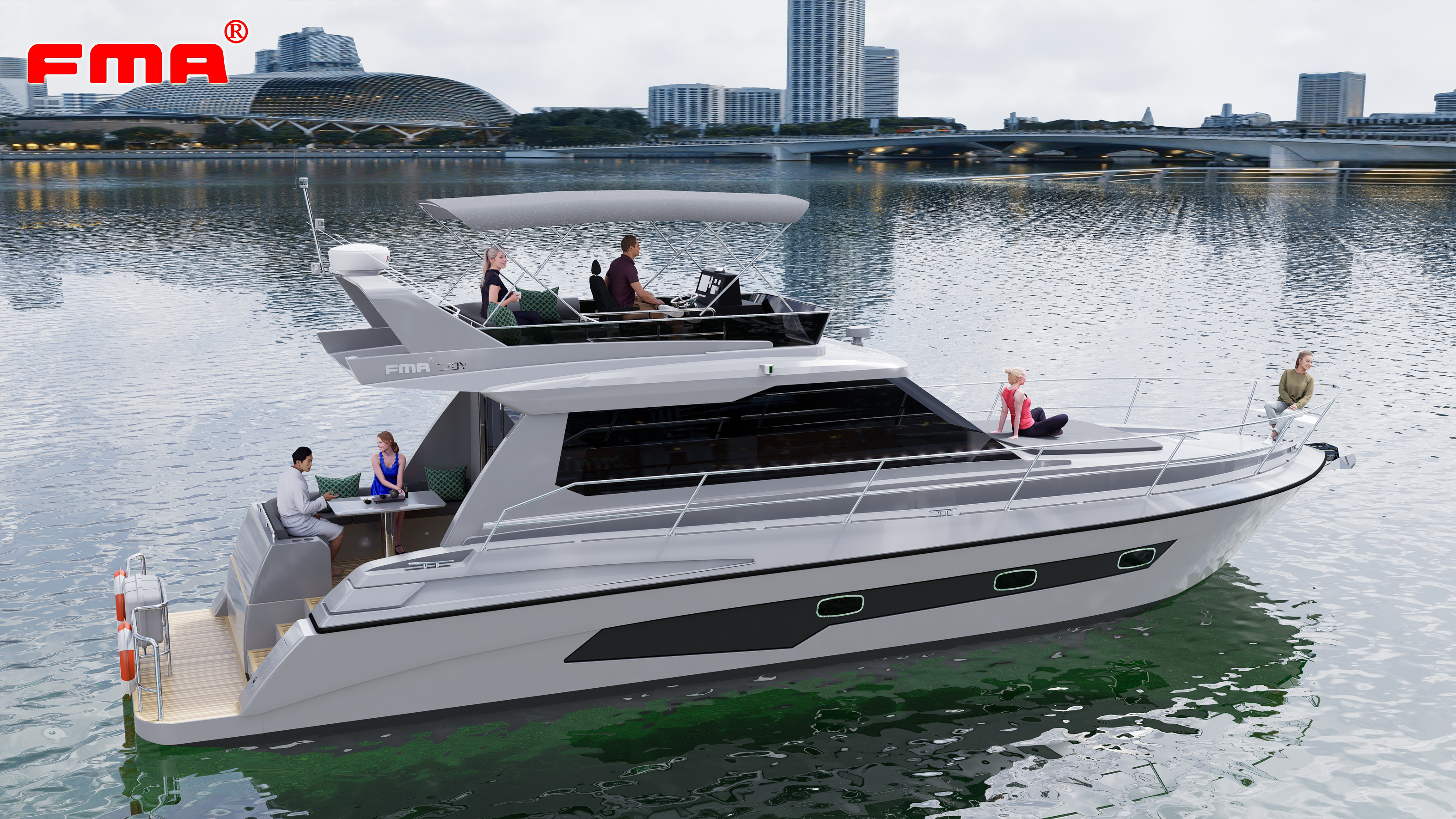 FMA520Y is a CCS Class III yacht with a total length of 15.8 meters, a hull length of 15.7 meters, a beam of 4.2 meters, and a moulded depth of 2.36 meters. The salon features a large sofa area and a dining area with a sound system. Inside the cabin, there is a large sofa seating area and a karaoke system. The kitchen is equipped with an induction stove, refrigerator, sink, and microwave. There is a spacious flybridge area. The aft deck has a sofa area, and the foredeck has sun pads. The yacht includes a double master suite and two double cabins. The flybridge has sofas and a helm station with a waterproof sunshade. It is powered by twin Yanmar 440 engines with dual helm stations, a fuel capacity of 2000 liters, and a water capacity of 400 liters, along with a 16 kW generator. The cruising speed is approximately 23 knots, with an economical speed of about 16 knots. It is rated for Class III waters with a minimum range of 200 nautical miles and is equipped with radar, side depth finder, fish finder, chartplotter, GPS, collision avoidance system, VHF, EPIRB, radar transponder, and a 12-person liferaft.