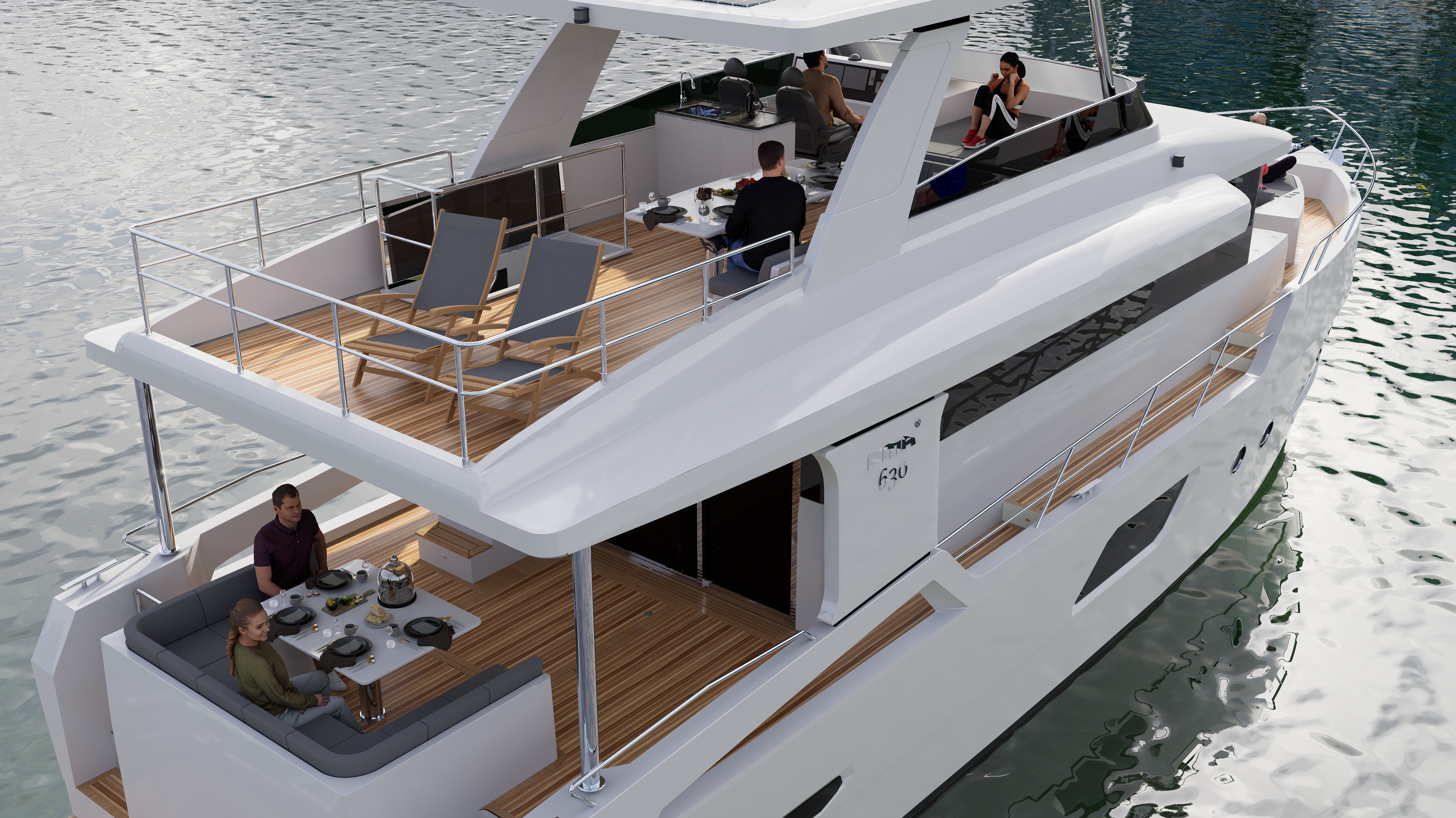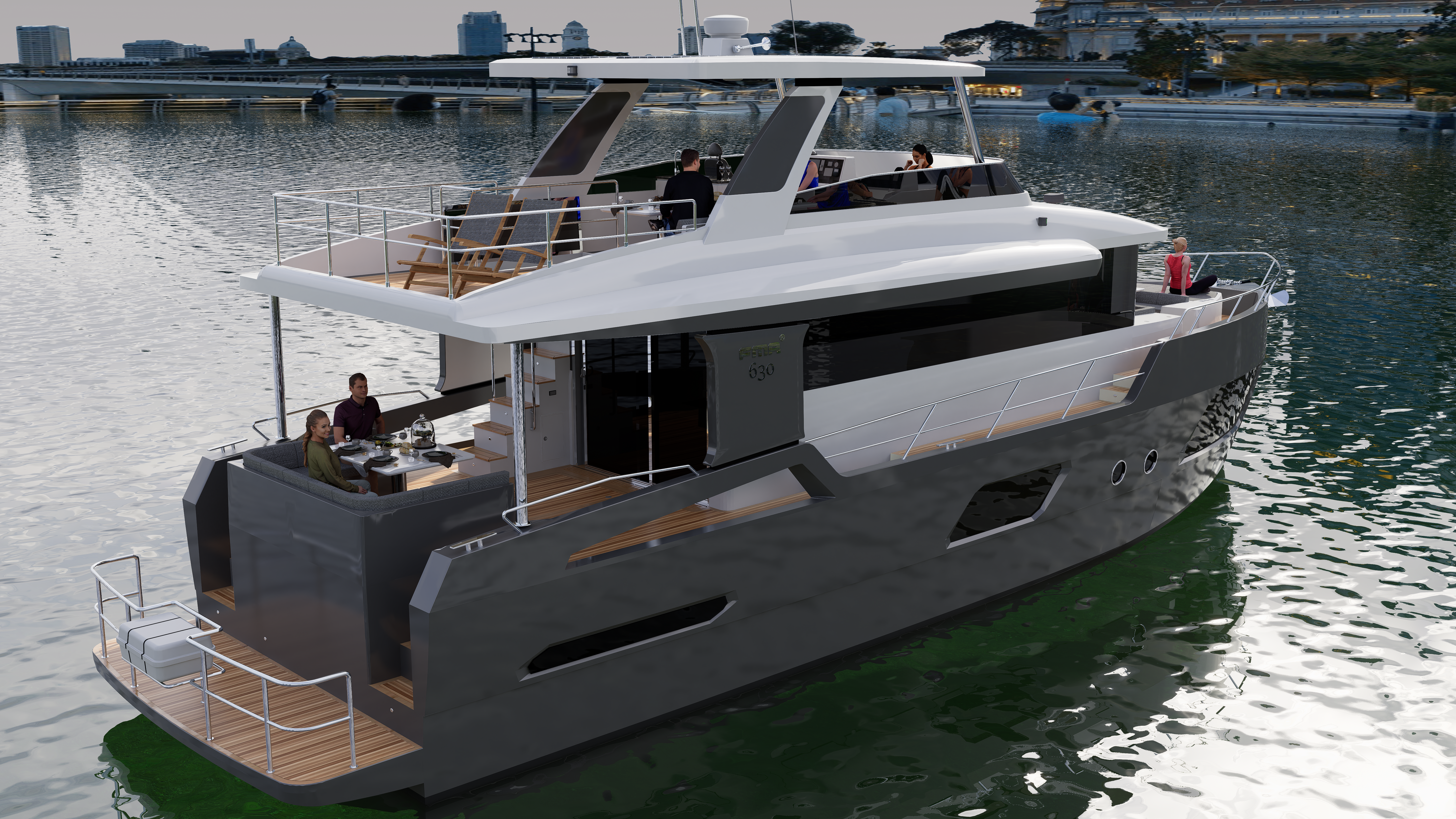 FMA630Y is a CCS Class II yacht with a total length of 19.1 meters, a length of 17.8 meters, a width of 5 meters and a depth of 2.18 meters. The salon has a large sofa area and a dining area, an audio and karaoke system, and a kitchen with an induction cooker, a refrigerator, a sink, a microwave oven, a large flybridge area, and sofa areas on the front and rear decks respectively. There are two double suites with bathrooms, a double room, a captain and sailor room with a bathroom, a total of 4 bathrooms on the ship, a sink and a barbecue grill on the flybridge, two Yanmar 580 engines and dual control stations, 3600 liters of oil, 400 liters of water, two 16-kilowatt generators, a speed of about 23 knots, and an economic speed of about 16 knots. It is in Class II navigation area with a cruising range of at least 400 nautical miles, radar, side depth, fish finder, nautical chart, GPS, collision avoidance system, very high frequency, medium and high frequency, wireless position indicating beacon, radar transponder, and a twelve-person life raft