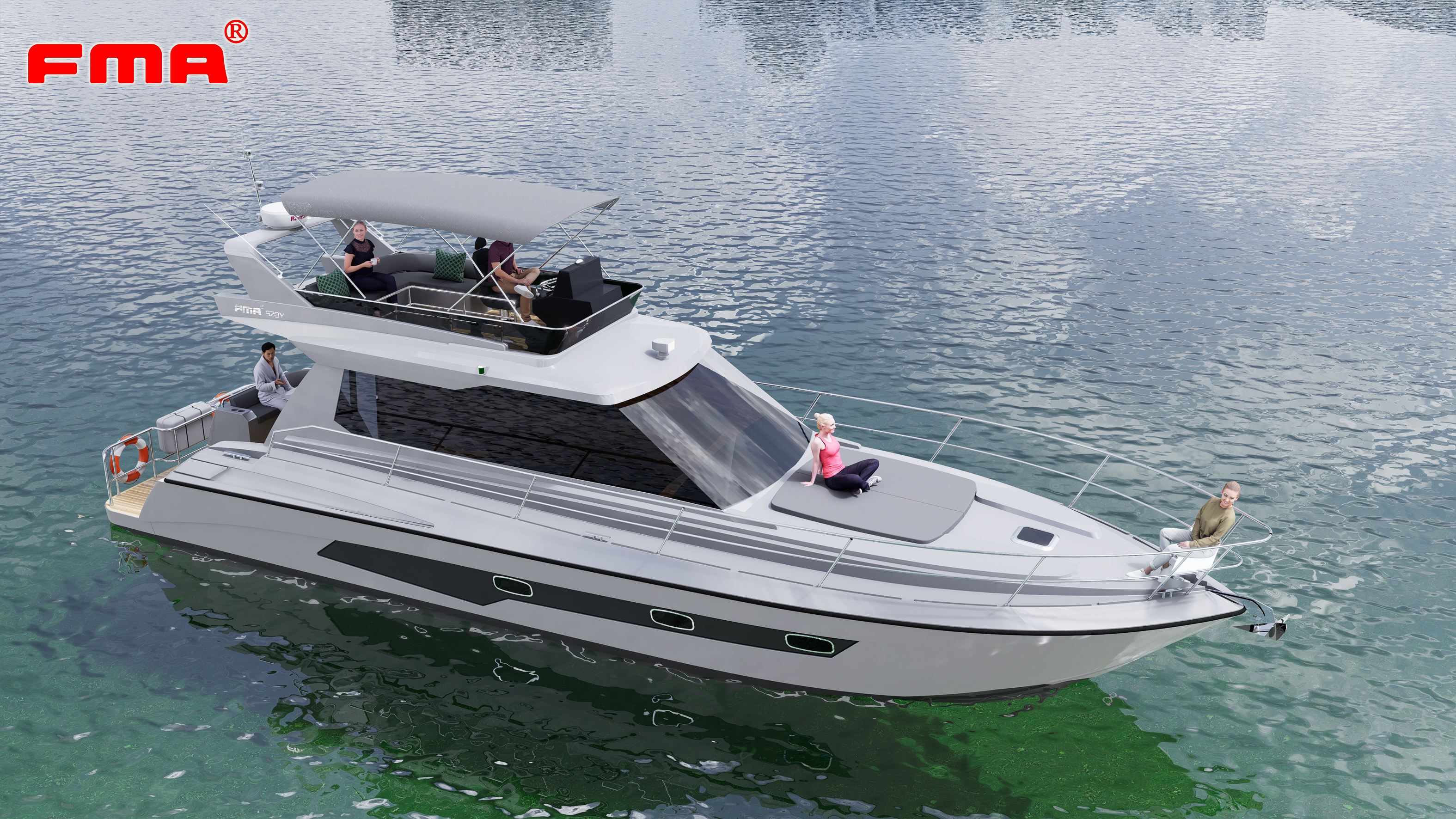 FMA520Y is a CCS Class III yacht with a total length of 15.8 meters, a hull length of 15.7 meters, a beam of 4.2 meters, and a moulded depth of 2.36 meters. The salon features a large sofa area and a dining area with a sound system. Inside the cabin, there is a large sofa seating area and a karaoke system. The kitchen is equipped with an induction stove, refrigerator, sink, and microwave. There is a spacious flybridge area. The aft deck has a sofa area, and the foredeck has sun pads. The yacht includes a double master suite and two double cabins. The flybridge has sofas and a helm station with a waterproof sunshade. It is powered by twin Yanmar 440 engines with dual helm stations, a fuel capacity of 2000 liters, and a water capacity of 400 liters, along with a 16 kW generator. The cruising speed is approximately 23 knots, with an economical speed of about 16 knots. It is rated for Class III waters with a minimum range of 200 nautical miles and is equipped with radar, side depth finder, fish finder, chartplotter, GPS, collision avoidance system, VHF, EPIRB, radar transponder, and a 12-person liferaft.