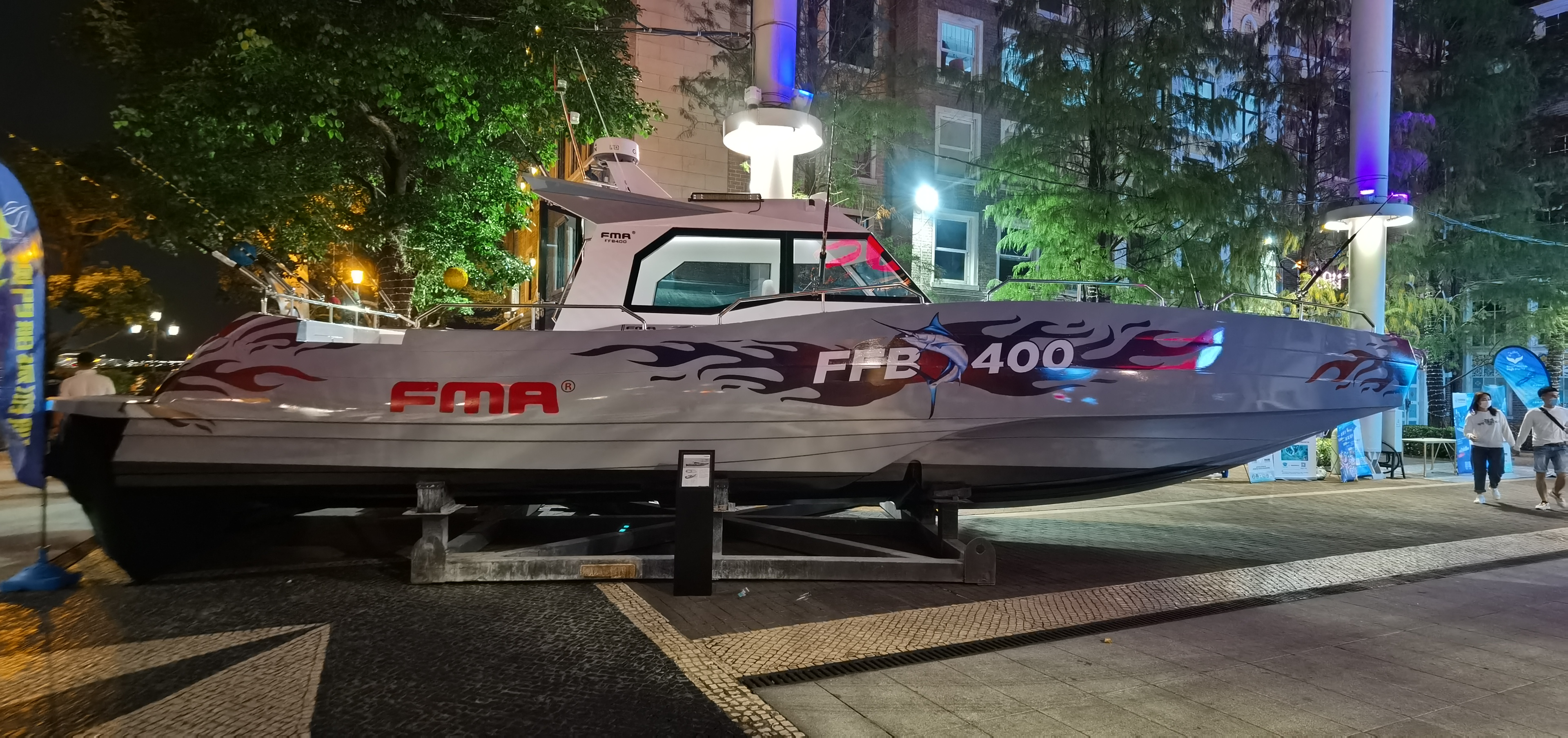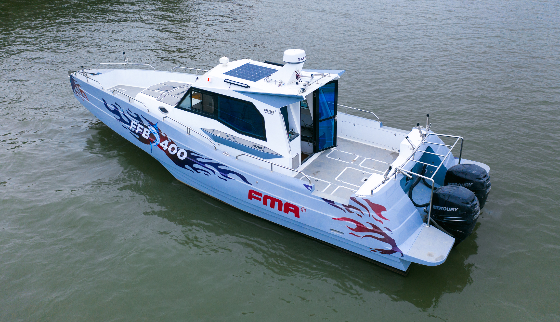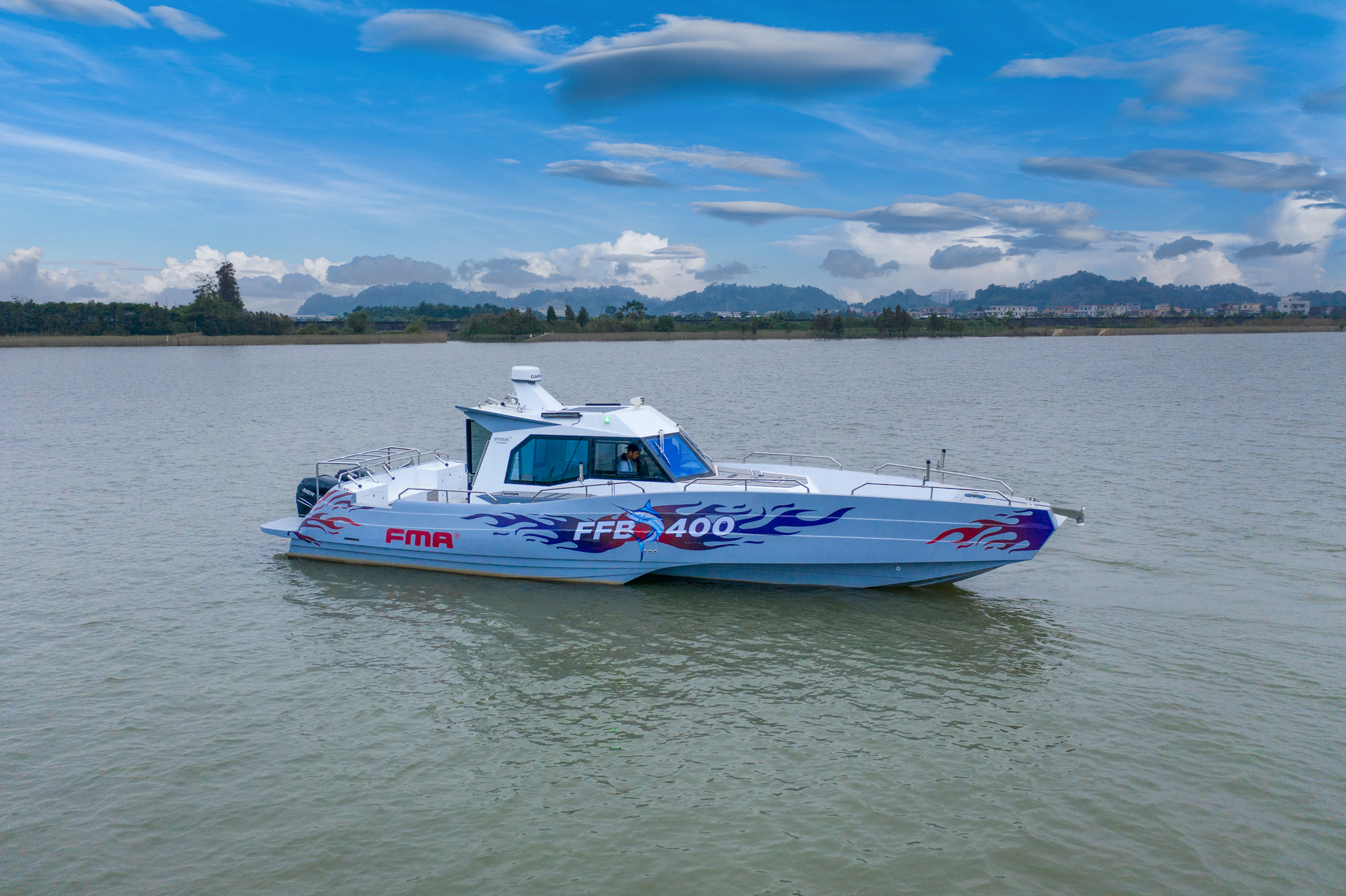 The FMA400 is a CCS Category IV trimaran with an overall length of 12.5 meters, a boat length of 11.9 meters, a beam of 3.9 meters, and a draft of 1.96 meters. It has a 1,500-liter fuel tank, a 200-liter water tank, and is equipped with two imported 350 engines, capable of a speed of 45 knots. It is equipped with air conditioning, radar, depth sounding, fish finder, nautical charts, GPS, VHF, radio position-indicating beacon, radar transponder, solar charging, and an electric winch.