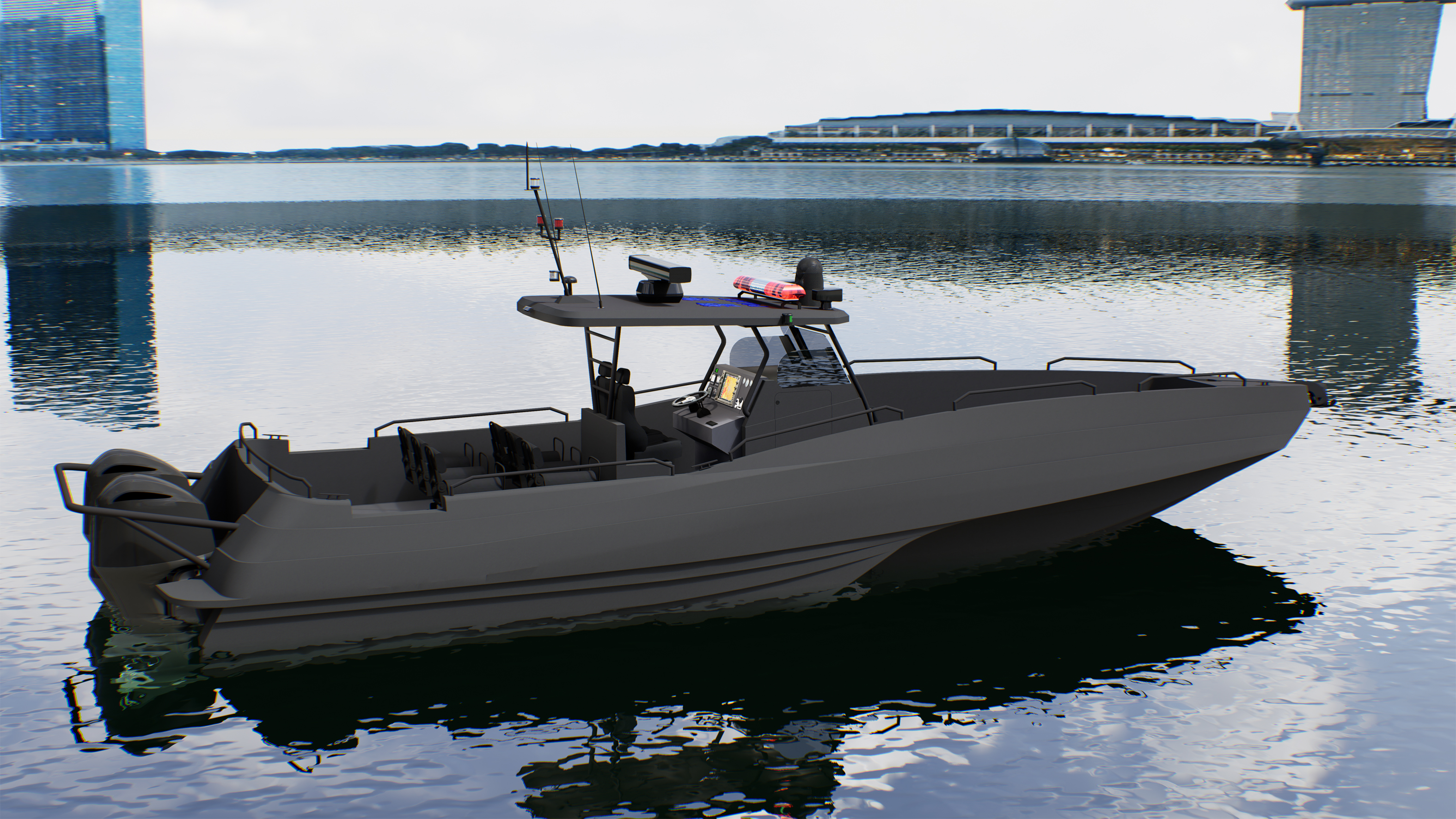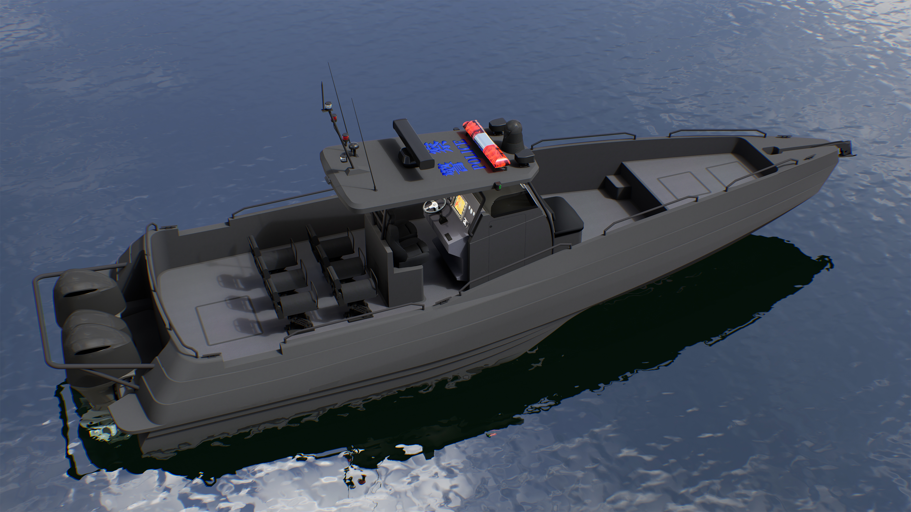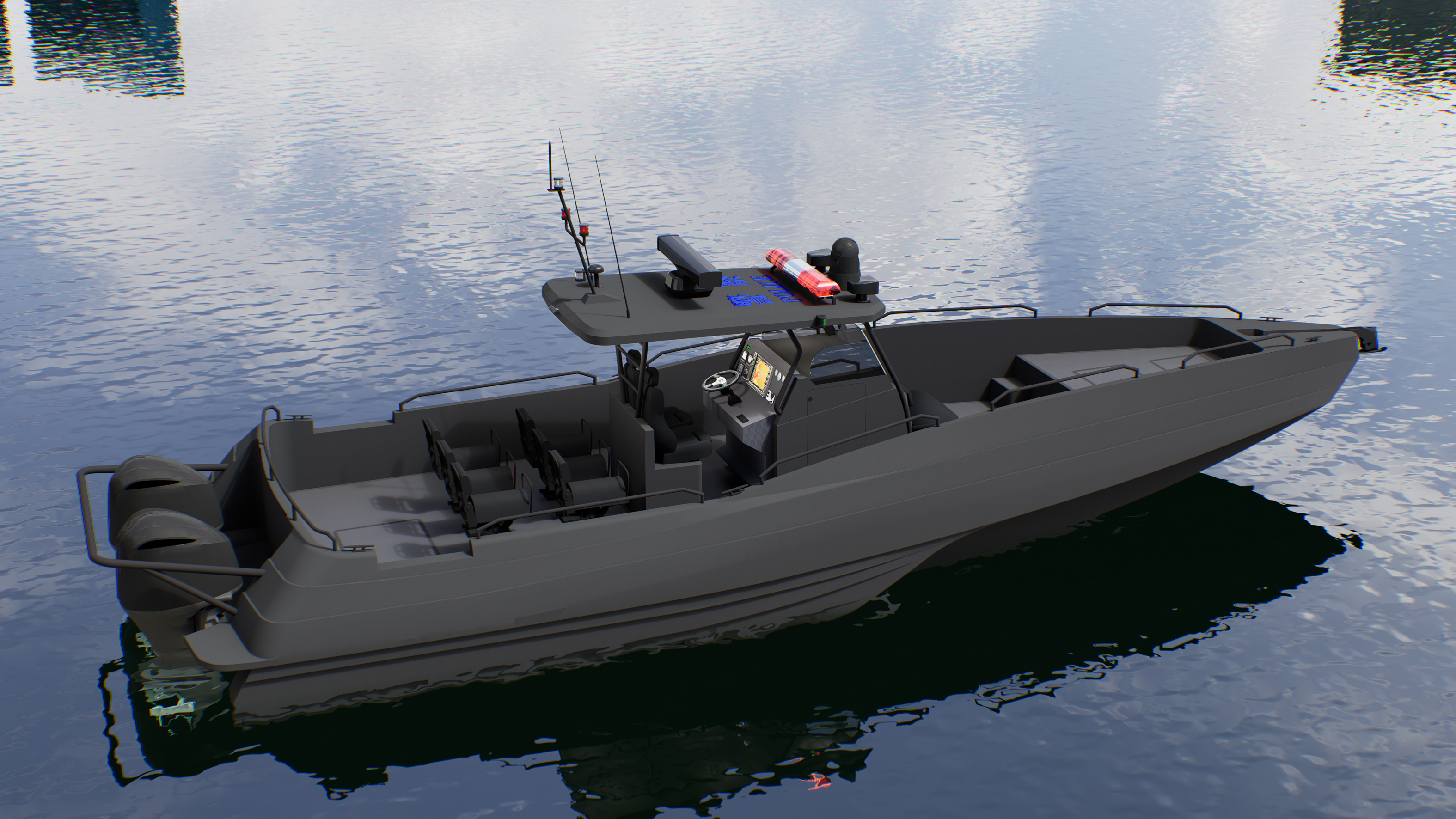 The FMA12M is a trimaran public service boat with an overall length of 12.5 meters, a boat length of 11.9 meters, a beam of 3.9 meters, and a draft of 1.96 meters. It has a 1500-liter fuel tank, a 300-liter water tank, and is equipped with two imported 350 engines, capable of a speed of 45 knots. It is equipped with radar, depth sounding, fish finder, nautical charts, GPS, AIS, VHF, radio position-indicating beacon, radar transponder, and solar charging. It also features six jockey chairs, two helm seats, and a private bathroom.